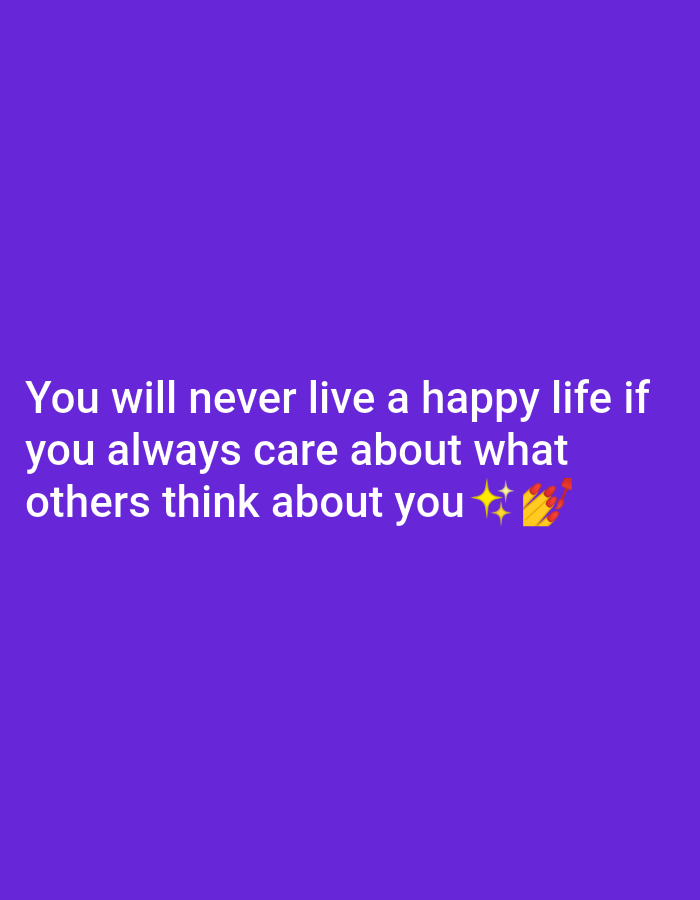 A digital image displays white text against a solid purple background. The text, centered horizontally, reads: "You will never live a happy life if you always care about what others think about you". To the right of the last word "you", a sparkling stars emoji and a golden trophy emoji are present. There are no people, physical objects, or discernible actions depicted within the image. The scene is located in Barza Municipality, Syria.