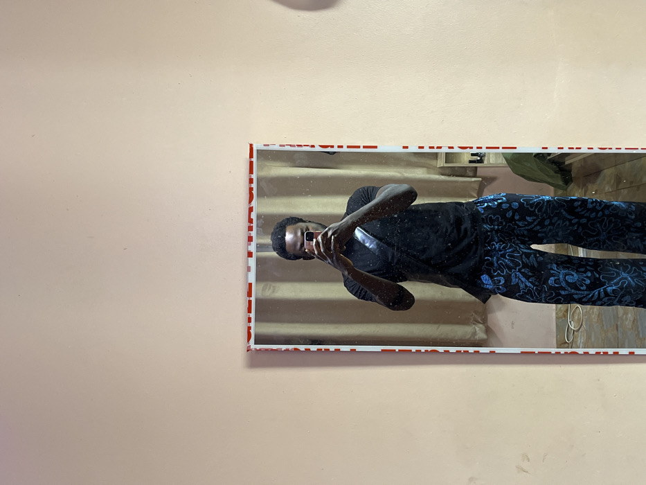 An adult male stands in front of a rectangular mirror, capturing his reflection with a dark-colored smartphone held in both hands, positioned to obscure his face. The individual has a dark complexion and short, dark, curly hair. He is wearing a black short-sleeved t-shirt, dark trousers with an intricate blue patterned design, and a dark crossbody bag slung across his chest. The mirror features a white frame with repeated red text, visibly displaying "FRAGILE" along its edges. Reflected in the mirror behind the individual are light beige curtains. To the right of the reflection, a small light-colored shelf or stand holds indistinct dark objects, while a white electrical cord and a dark green fabric item are visible on the floor. The wall surrounding the mirror is painted a light peach color. The scene is located in Sabon Tasha, Nigeria.