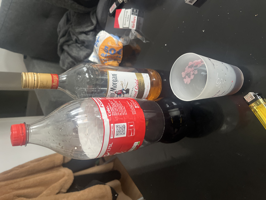 This image depicts an indoor scene on a dark, reflective table surface, likely within a private residence in Saint-Just-en-Chaussée, France. Prominently displayed are a partially consumed 1.75L plastic Coca-Cola bottle with a red label and a nearly empty glass bottle of Captain Morgan Original Spiced Gold rum, featuring a gold cap. A frosted glass cup, partially filled with a dark liquid and containing a small pink decorative floral element, rests nearby. Also on the table are a red and white pack of Marlboro cigarettes bearing the warning "Smoking kills," a yellow translucent disposable lighter, and a second black and silver lighter. In the background, a dark gray fabric sofa is partially visible with a dark blanket draped over it, along with a crumpled white and orange plastic bag. To the far left, a light brown furry garment or blanket is present. No individuals are visible.