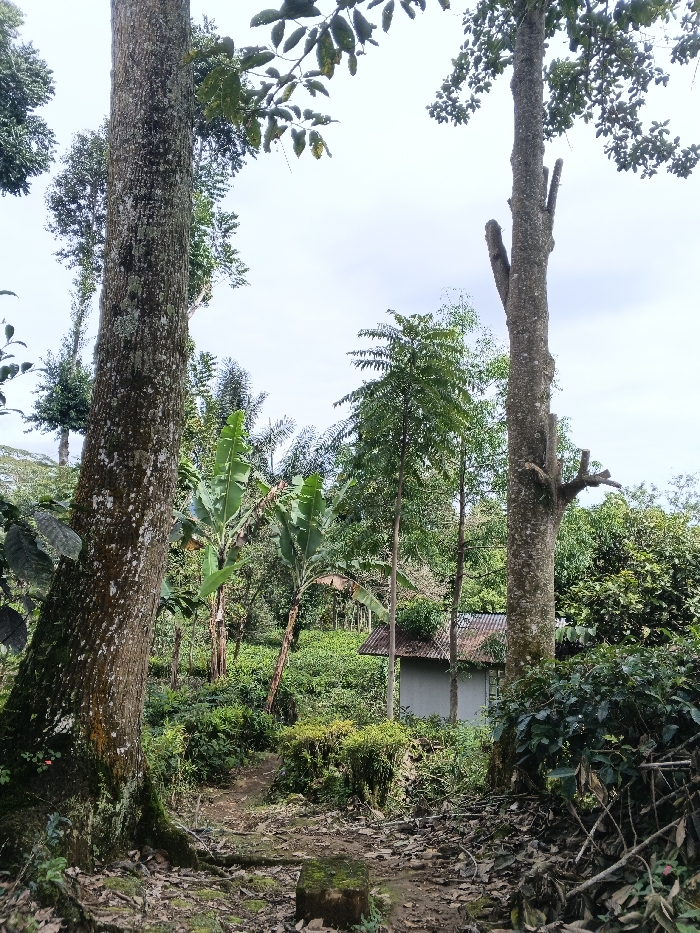 A dense forest scene under a cloudy sky. Two large, textured trees frame the view. Banana plants and various other vegetation fill the mid-ground, leading to a small, single-story building with a corrugated metal roof. A narrow dirt path stretches toward the structure, disappearing into the lush undergrowth. Fallen leaves and exposed tree roots litter the ground in the foreground.