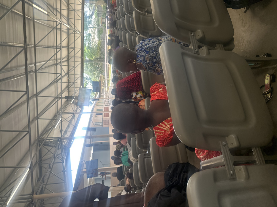 The image depicts an indoor scene within a large, open-sided structure, likely a hall or event space, in Ozuaha, Nigeria