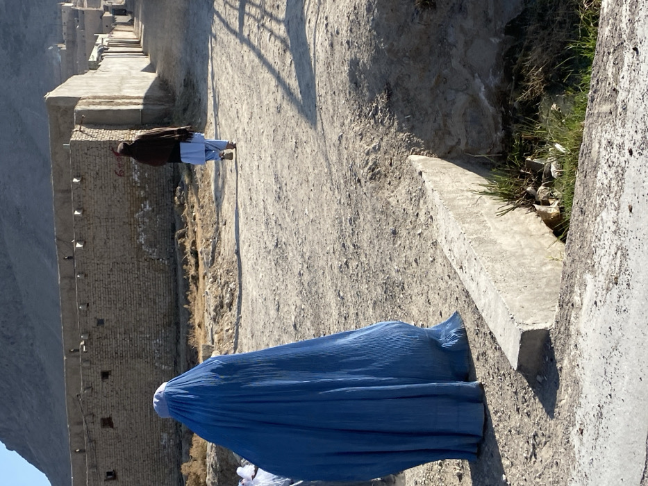This image depicts an outdoor scene in کوکران, Afghanistan, under clear, sunny conditions. The primary visible ground is an unpaved, light-colored dirt path with visible tire tracks or footpaths. In the left foreground, a person stands with their back to the viewer, completely enveloped in a full-length, pleated blue burqa. A light-colored head covering is visible beneath the burqa's hood. To the immediate left of this individual, a partial view of a third person wearing white clothing is discernible. Approximately mid-ground and further down the path, another individual walks away from the camera. This person is dressed in a light blue shalwar kameez and has a dark brown shawl or blanket draped over their head and shoulders. They appear to be barefoot or wearing light sandals. Shadows, notably from this walking figure and an unseen structure to the right, are cast long across the dirt path. A concrete barrier, approximately one foot high and several feet long, runs horizontally in the lower mid-ground, bordering a shallow ditch containing sparse green and dry vegetation, along with some visible debris and litter. The background features a low, light-colored brick or mud-brick wall with multiple rectangular openings, extending horizontally across the mid-distance. Beyond this wall, a series of similar, rudimentary buildings or walls line the dirt path as it recedes into the distance, suggesting a village or town street. An arid mountain range forms the distant horizon under a clear blue sky.