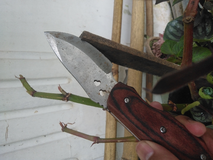A close-up, vertical image depicts a light-skinned hand gripping a knife in what appears to be an outdoor or semi-outdoor plant environment in Los Ramírez, Mexico. The knife features a dark reddish-brown wooden handle secured by three visible metallic rivets. Its metallic blade exhibits wear and discoloration, with a pointed tip and two irregular perforations near the handle. The blade is positioned against a dark brown, rectangular object, possibly a piece of wood or brick. In the background, two green plant stems with small protrusions are visible against a white, vertically ribbed surface. Horizontal wooden slats are present behind the knife, and various green foliage and reddish plant stems populate the lower and right portions of the frame. An out-of-focus, dark, elongated object extends from the bottom, passing in front of the knife's handle.