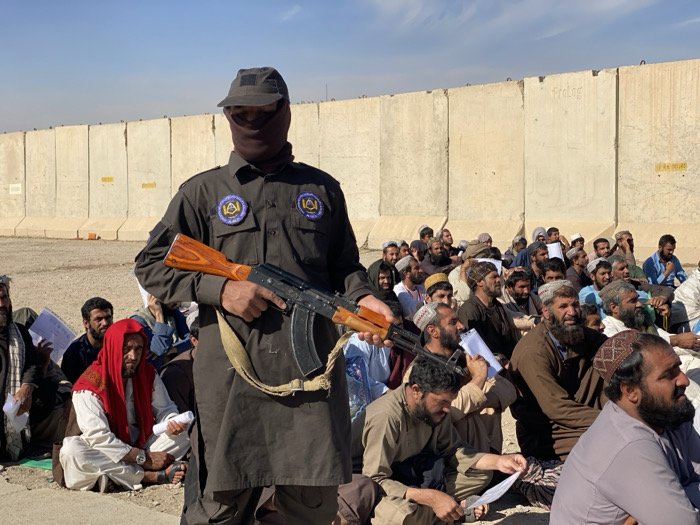 In Mandisar, Afghanistan, a uniformed individual stands foreground center, holding an AK-pattern rifle with a wooden foregrip and stock