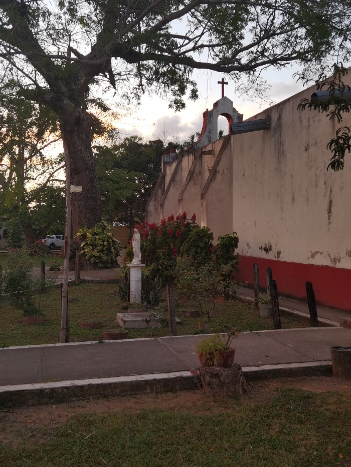 The image depicts a scene in Bacalar, Mexico, at the coordinates 18.679, -88.391. The scene features a large, weathered tree on the left side of the image, with its branches reaching towards the sky. In the background, a large, white wall with a red stripe at the bottom stretches across the image. The wall has a section that protrudes slightly, which appears to be a portion of a building, possibly a church or chapel. A red cross sits atop the protruding section, and a white, arched structure below the cross suggests a doorway. There is a statue of a woman, seemingly dressed in a white robe, situated in front of the wall on a small pedestal. The statue is positioned in a patch of green grass in front of a cluster of red flowers and green foliage. In the foreground, a gray sidewalk leads from the bottom center of the image towards the wall. A potted plant is visible on the right side of the sidewalk. The overall scene is tranquil and peaceful, with a sense of calmness and serenity.