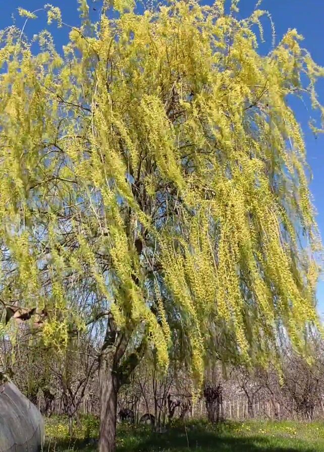 The video presents a full, blossoming weeping willow tree against a clear blue sky. The tree is full of yellow-green catkins, creating a dense, drooping canopy. The camera is positioned at a low angle, looking up at the tree, emphasizing its height and the cascade of branches. The tree is situated in a field of green grass. In the background are other trees and a glimpse of what appears to be a greenhouse or structure covered with translucent material. The scene is static, with no visible people or animals. The lighting is bright and sunny, highlighting the vibrancy of the tree's blossoms.