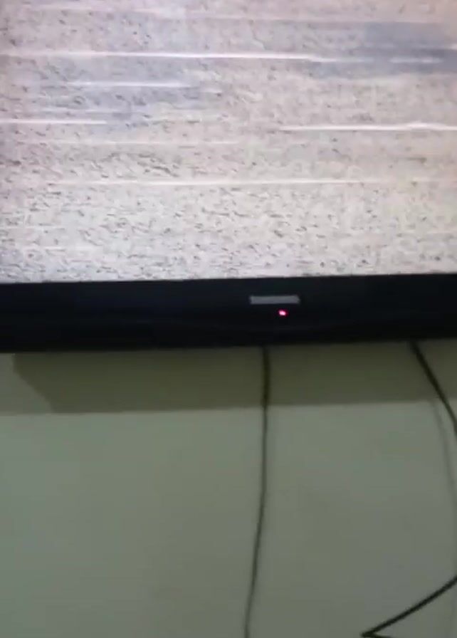 A Samsung television, wall-mounted, displays static. The screen then goes black, and a red light illuminates on the bottom bezel. Black power cables hang below the television. The wall behind the television is white.