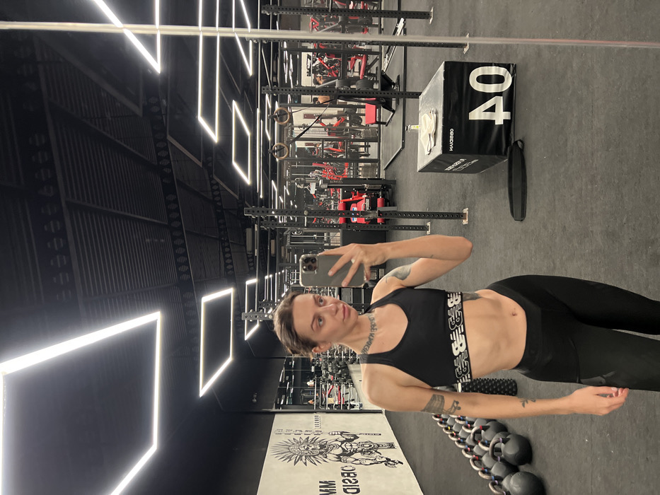 A lean adult female is depicted taking a mirror selfie inside a gymnasium located in Munggu, Indonesia