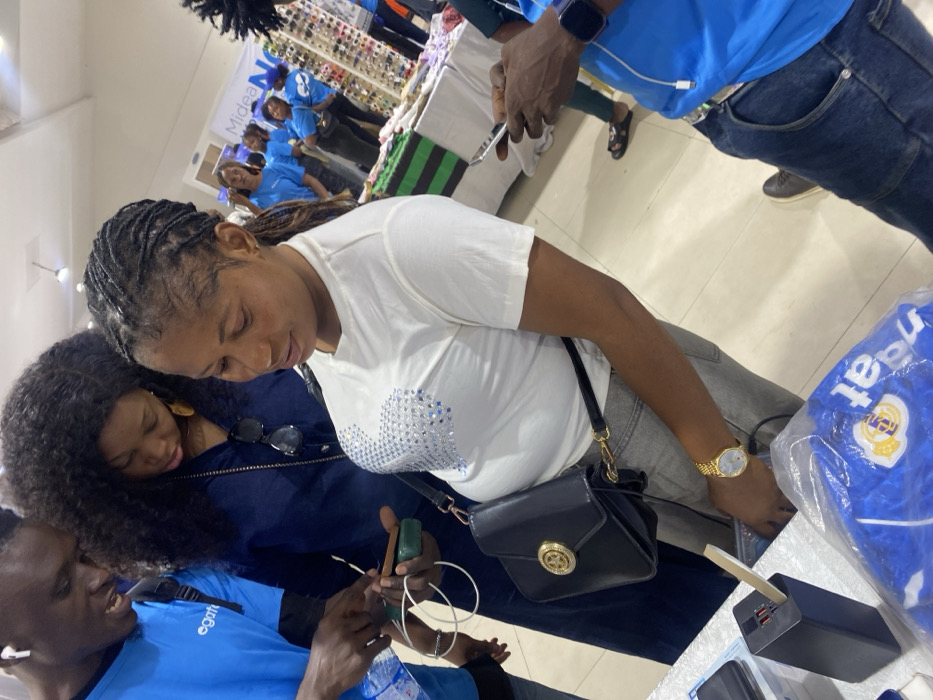 The image captures an indoor commercial event, likely a product demonstration or sales exhibition, taking place in Ikeja, Nigeria. In the immediate foreground, three Black individuals are engaged around a white display table. On the left, a Black male, wearing a blue t-shirt with "eagate" branding and white earbuds, holds a green rectangular device with a white cable, pointing at its surface with his right index finger, seemingly demonstrating its function. Next to him, a Black female with dark, curly hair, dressed in a dark blue long-sleeved shirt with sunglasses hanging from her neckline, leans forward, observing the device. To her right, a Black female with dark braided hair, wearing a white t-shirt adorned with silver embellishments, grey pants, a black shoulder bag with a gold circular emblem, and a gold wristwatch on her left wrist, also directs her gaze downwards at the items on the table. On the table in front of the female in the white t-shirt, a black multi-port charger is visible, with a light-colored stick-like object inserted into one of its ports. Adjacent to it is a clear plastic bag containing a folded blue fabric item, possibly a t-shirt or jersey, with a white crest logo and partial text (e.g., "maai" or "eagate"). The far right foreground shows the left arm and hand of another Black male, wearing a blue shirt and a black smartwatch, actively holding and looking at a white smartphone. In the background, several additional individuals, predominantly Black females, are visible wearing blue t-shirts, suggesting they are staff or promoters for the event. They stand behind white display tables showcasing various products, including sunglasses on a rack. A partial banner in the upper right background displays the text "Midea NO" or "Midea Now," indicating a brand presence or event theme. The environment is brightly lit with white walls and a light-colored floor, consistent with an exhibition hall or retail space.