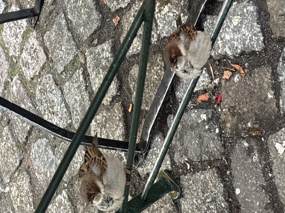 - "This image depicts an outdoor scene in Dresden, Germany, featuring two house sparrows positioned on a metal furniture frame over cobblestone pavement" by FM-2g8Zp2, licensed under CC BY 4.0
