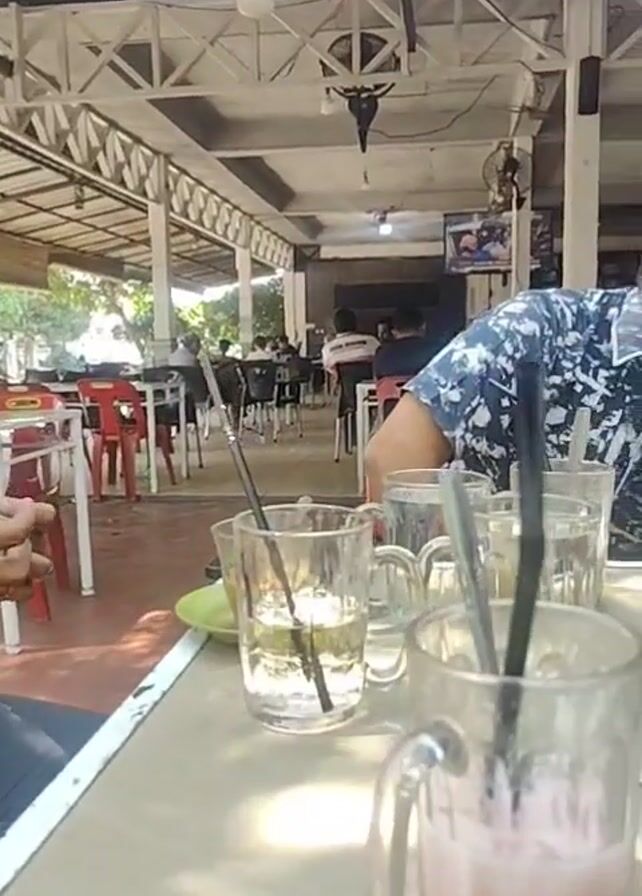 four men sitting at a table in what appears to be an outdoor café or restaurant. The space is covered with a white-painted, geometric-patterned roof. Sunlight streams in, and the café appears to have a good number of patrons. The men are seated around a table, which has several empty glass mugs and a small green plate on it. There are also cigarettes, lighters, phones, and a black rectangular box on the table. One of the men is wearing a blue and white patterned shirt, another is in a light blue button-down shirt, and a third is wearing a dark-colored shirt. The fourth man is partially visible on the left and appears to be wearing a dark shirt and pants. The men seem to be engaged in conversation, with one looking at his phone. In the background, other people are sitting at tables, and a television screen is visible on a wall. The cafe's logo "d!rup!" is on the wall in the background.