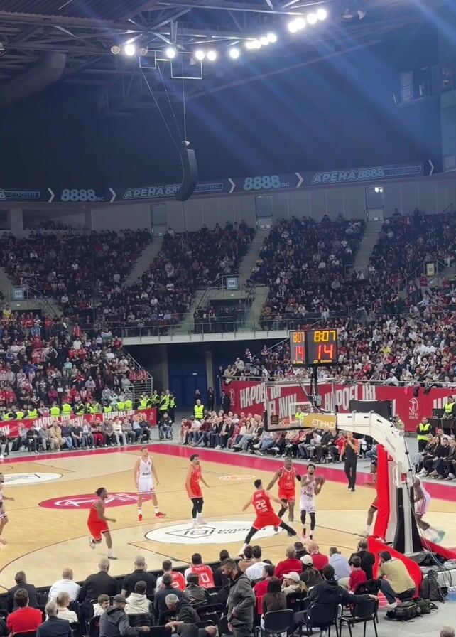 basketball game in a large arena. The arena is filled with spectators, many of whom are wearing red and white. The court is made of light-colored wood with a geometric design in the center. Players in red and white uniforms are actively playing the game, and one player in a white uniform has just scored a basket. A large scoreboard overhead shows the game time and score. There are chairs around the court's perimeter, with people seated in them. The lighting is bright, illuminating the entire court and much of the audience.