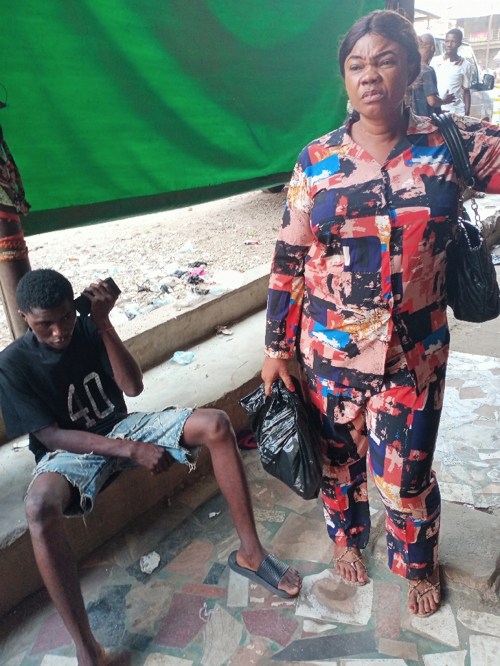 The scene depicts an outdoor or semi-outdoor urban environment in the city of Unknown, Unknown. An adult female stands on the right side of the frame, wearing a long-sleeved button-up shirt and matching pants featuring an abstract pattern of red, blue, black, and peach colors. She wears golden-colored flat sandals, carries a black quilted handbag on her left shoulder, and holds a black plastic bag in her right hand. Her expression is neutral, and her gaze is directed slightly off-camera. To her left, a young adult male sits on a concrete ledge. He is dressed in a black t-shirt with "40" printed in white on the front, ripped light blue denim shorts, and a black slide sandal on his left foot; his right foot is bare. He holds a black rectangular object to his right ear, as if communicating. Visible on his left wrist are orange and brown wristbands. The background includes a large green tarp serving as a canopy or awning, a dirty ground surface with scattered litter (plastic, paper), and two less distinct male figures standing further back on the right. The ground beneath the primary figures is composed of multi-colored, irregularly shaped tiles.