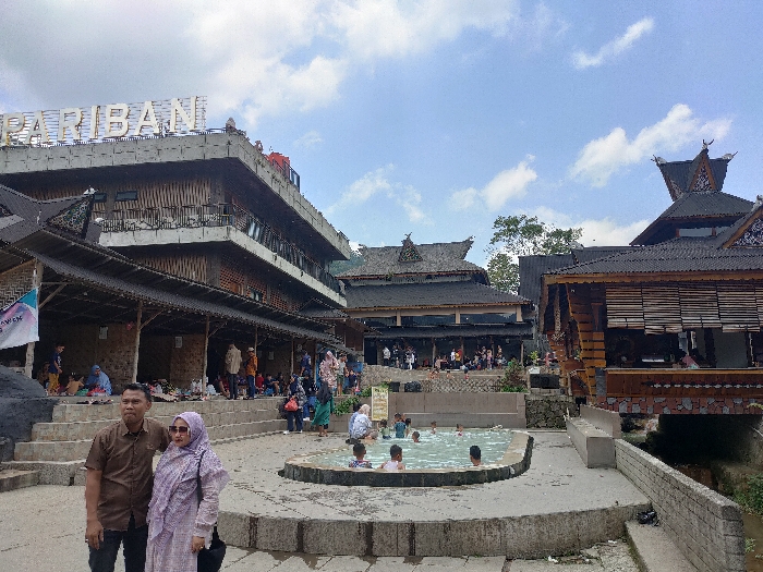 The image depicts a crowded outdoor leisure complex at Pemandian Air Panas Pariban in Semangat Gunung, Indonesia, under a partly cloudy sky