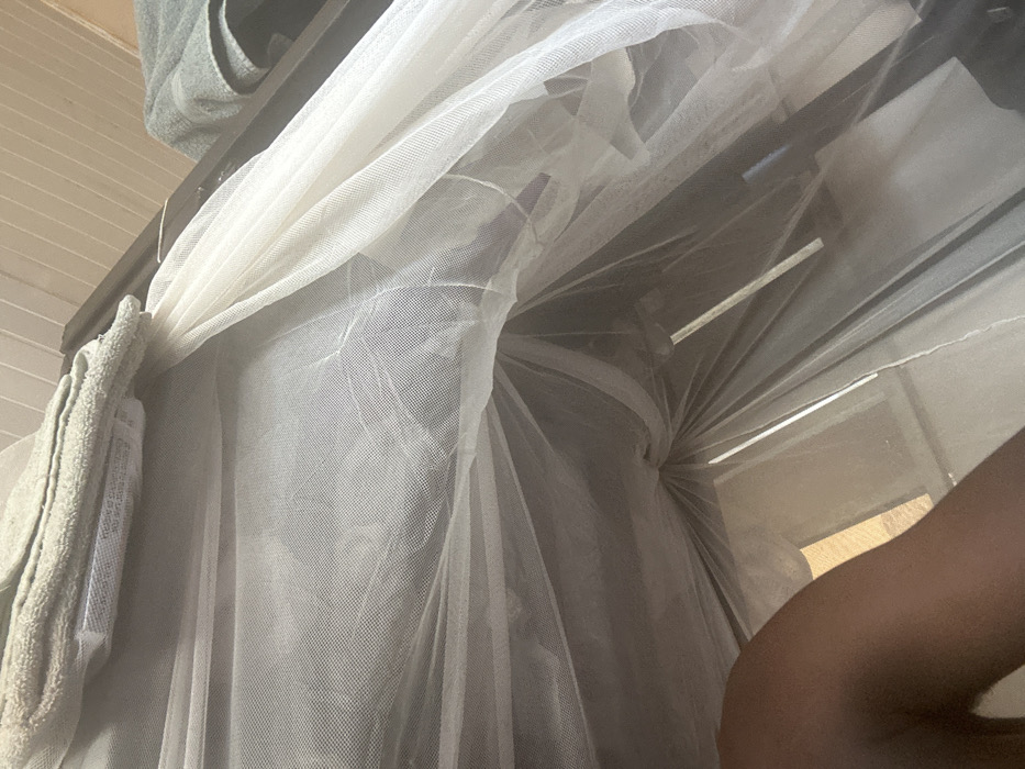 The image, taken in the city of New Nyanya, Nigeria, presents an upward-angled view from within a white, fine-mesh mosquito net
