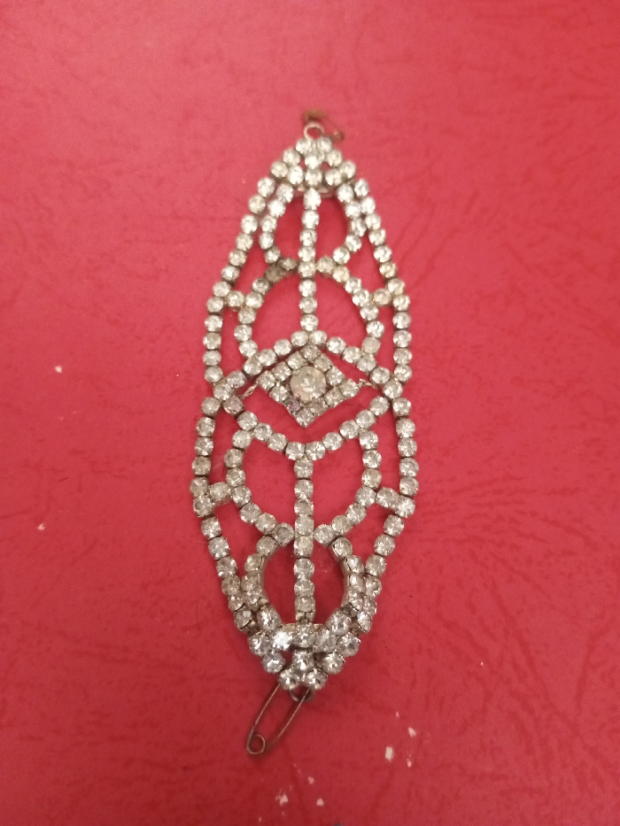 - "An elongated, teardrop-shaped ornament with a silver-toned metal framework is studded with numerous small, clear rhinestones" by FM-fyO3e2, licensed under CC BY 4.0