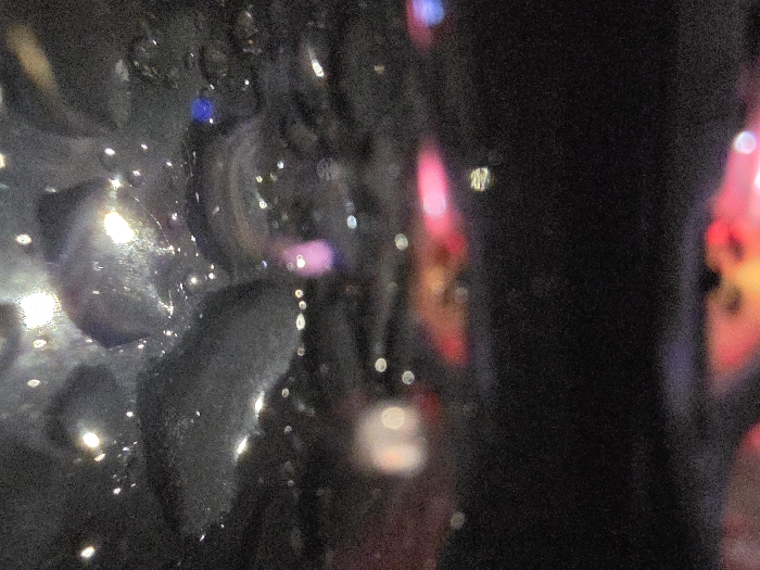 A blurry image shows glistening, dark, bulbous shapes on the left, possibly coated in moisture or reflective material. Tiny bright points are scattered across these shapes. The right side of the image is dominated by a dark, undefined area, with diffused red and yellow light sources in the background. The overall impression is one of abstraction and limited visibility.