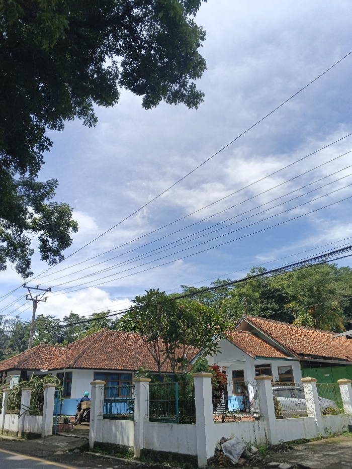 A low-angle shot showcases two white buildings with orange tile roofs behind a white fence with blue accents. Trees frame the top of the shot, creating a partial canopy over a partly cloudy sky with visible power lines. A person on a scooter is positioned behind the fence to the left. A car is parked in front of the building on the right. Green foliage is abundant in the background.