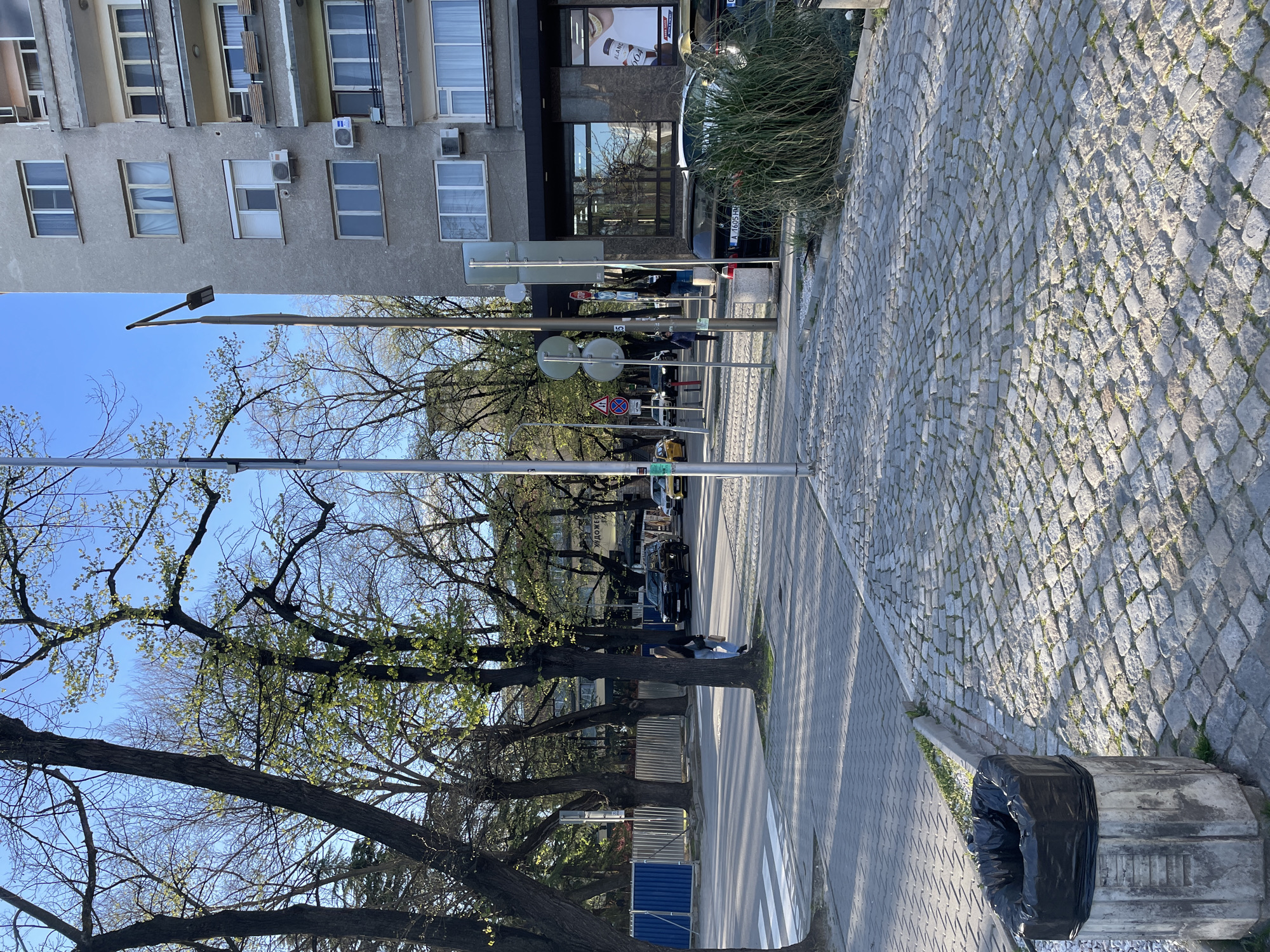 The image depicts a street scene in Stara Zagora, Bulgaria, characterized by a combination of urban infrastructure and natural elements. A cobblestone pavement dominates the foreground, leading to a sidewalk with a concrete trash receptacle with a black trash bag inserted. The street runs parallel to the sidewalk, separated by a row of mature trees with budding foliage. Buildings line the opposite side of the street, featuring both residential and commercial spaces, as evidenced by windows, air conditioning units, and signage. Pedestrians are visible on the sidewalk, engaged in various activities. A series of traffic signs and light poles are present. The overall scene suggests a typical urban environment, with a blend of residential, commercial, and recreational elements.