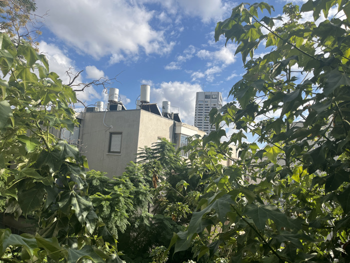 The image depicts an urban landscape in Tel Aviv, Israel, under a partly cloudy blue sky. The foreground is heavily dominated by dense, sunlit green foliage from various broad-leafed trees and shrubs, partially obscuring the view of structures beyond. In the midground, a light-colored, multi-story building with a flat roof is visible. Its rooftop is equipped with at least six white cylindrical tanks, identified as solar water heaters, along with several rectangular air conditioning condenser units or solar thermal collectors. Electrical conduits or plumbing lines are present on the roof. A single rectangular window with a horizontal blind is visible on the building's facade. Additional green trees and shrubbery are situated around the base of this building. In the background, a tall, modern, light-colored high-rise building with multiple windows is discernible against the sky, indicating a significant urban structure in the distance. No individuals, animals, or vehicles are present in the scene.