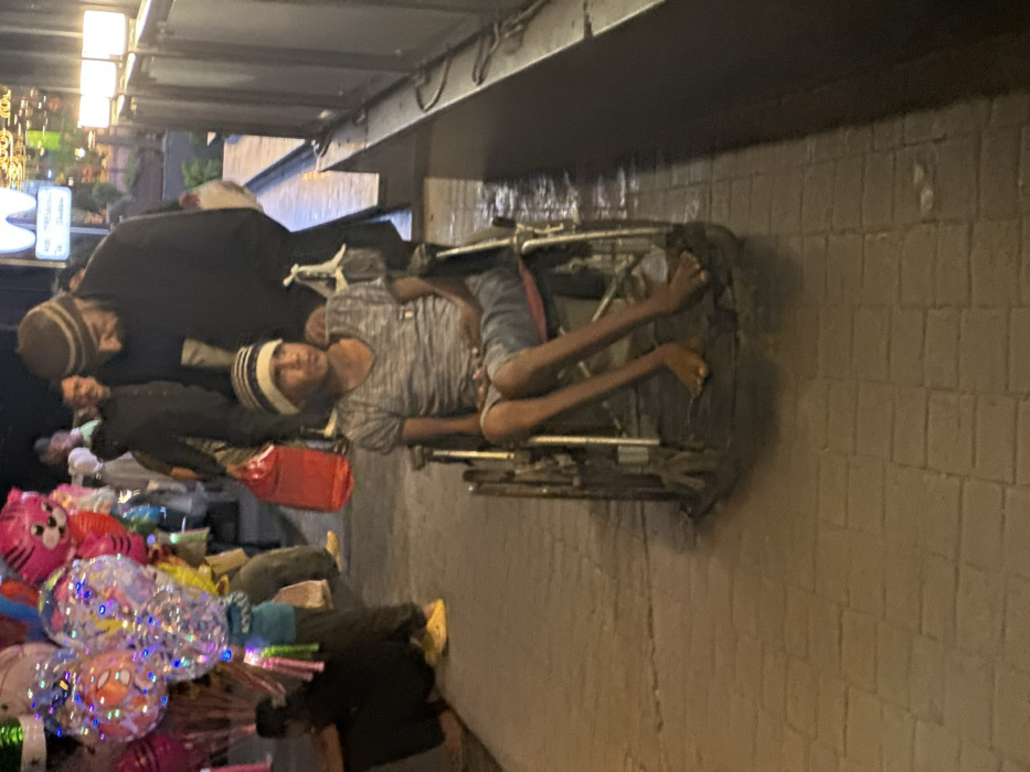 - "An adult male with a beard and a striped beanie pushes a manual wheelchair carrying a male minor in a striped beanie, grey V-neck shirt, and blue shorts through a paved pedestrian area at night in Barza Municipality, Syria" by FM-shBps1, licensed under CC BY 4.0
