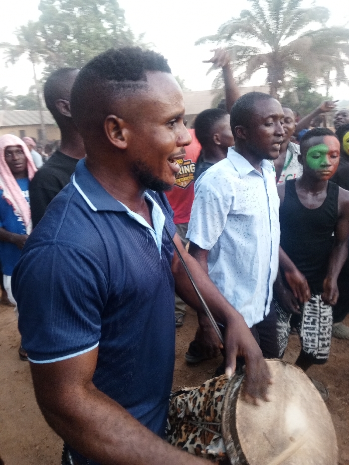 Several people are gathered outdoors, possibly for a celebration. In the foreground, a man plays a drum, wearing a dark blue polo shirt. Beside him, another man wears a light blue patterned shirt. To the right, a person with green and red face paint wears a black tank top and patterned shorts. Behind them, a crowd is visible, with varying attire and expressions. A palm tree and buildings appear in the background, suggesting a tropical or semi-tropical location.
