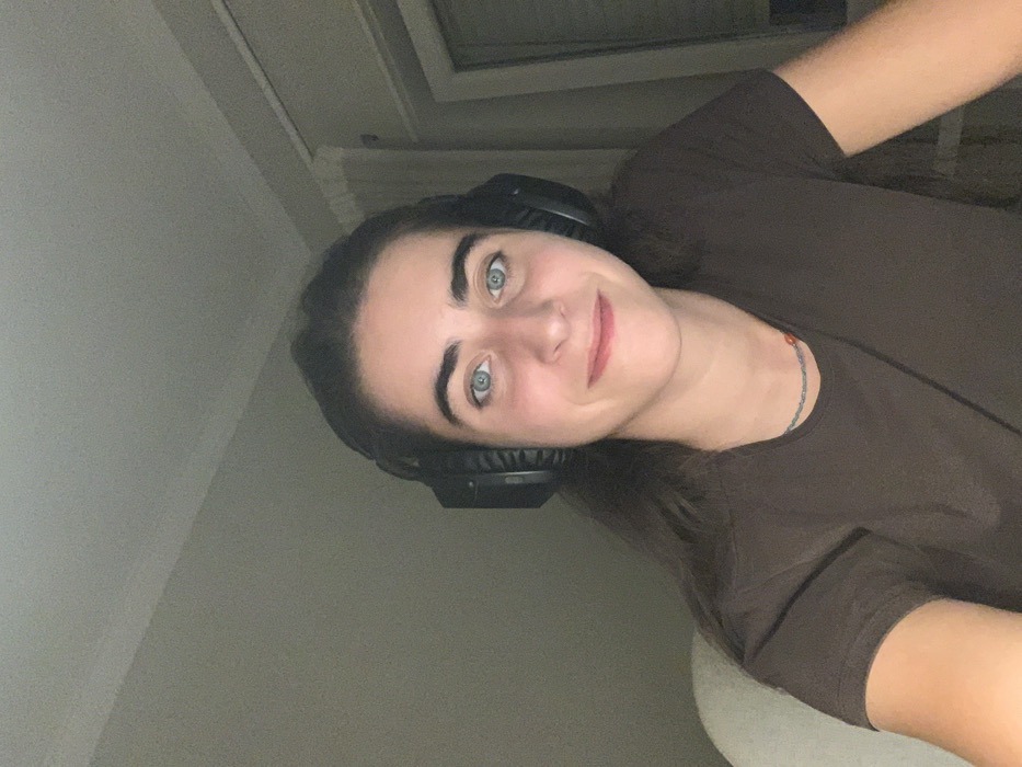 The scene depicts an indoor setting, identified as located in Lisbon, Portugal. A young female subject is positioned centrally, facing directly towards the viewer. She has light blue eyes and dark brown hair worn down, partially obscured by black over-ear headphones. She is wearing a short-sleeved dark brown t-shirt and a thin necklace with small blue and orange beads. Her expression is a slight closed-lip smile. The background features a plain, light-colored wall, with a visible ceiling line. A portion of a light-colored chair is present to the subject's lower left, and a window with a light-colored curtain is visible to her right. The room is dimly lit, suggesting artificial illumination.