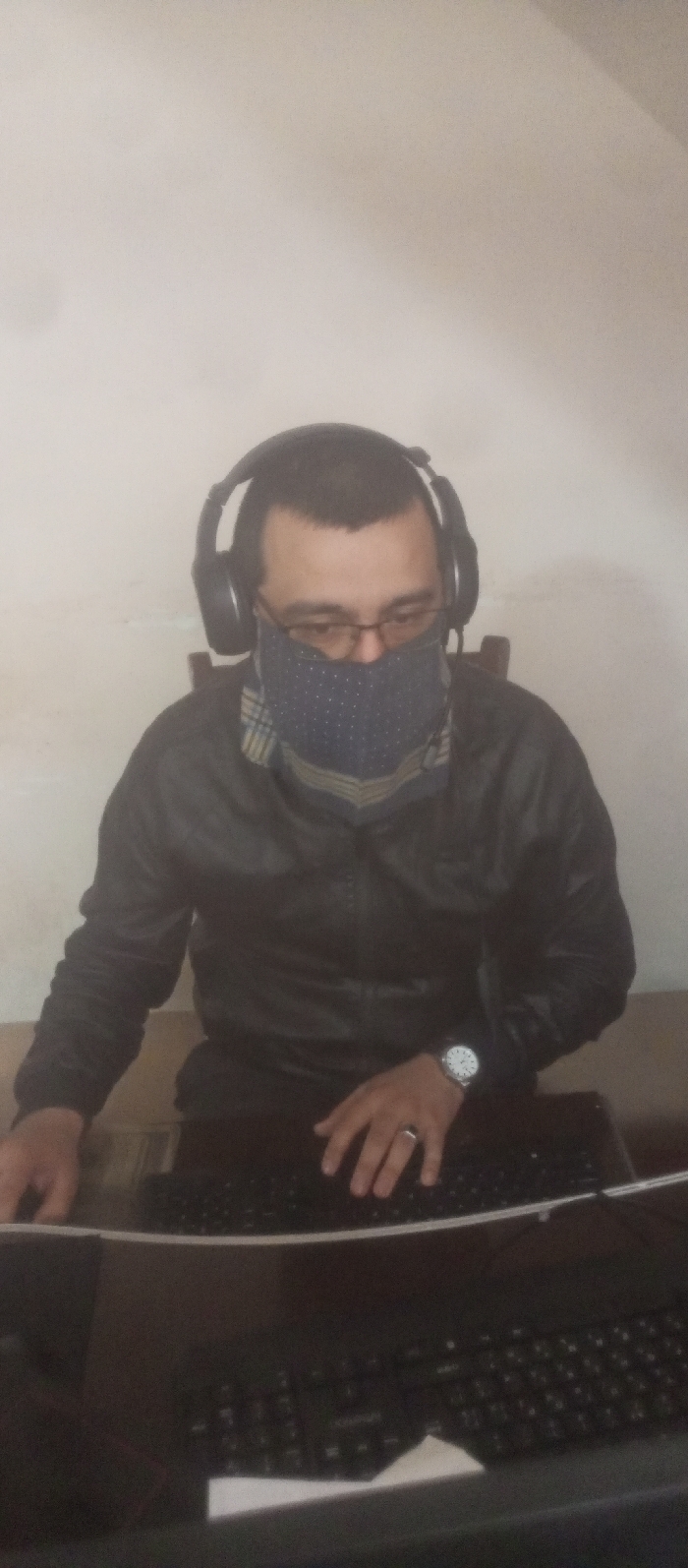 An adult male is seated indoors at a dark wooden desk. The background is a plain, light-colored wall. He wears black over-ear headphones, prescription eyeglasses, and a dark blue cloth face mask with white polka dots, covering his nose and mouth. His attire includes a dark jacket over a collared shirt with a light-colored plaid or striped pattern. A silver-colored wristwatch is on his left wrist, and a silver ring is on his left ring finger. His hands are positioned over a black computer keyboard on the desk. A reflection of a keyboard and his hands is visible on a dark, glossy surface in the immediate foreground. A dark wooden chair back is partially visible behind the individual. The location is an unspecified indoor setting.