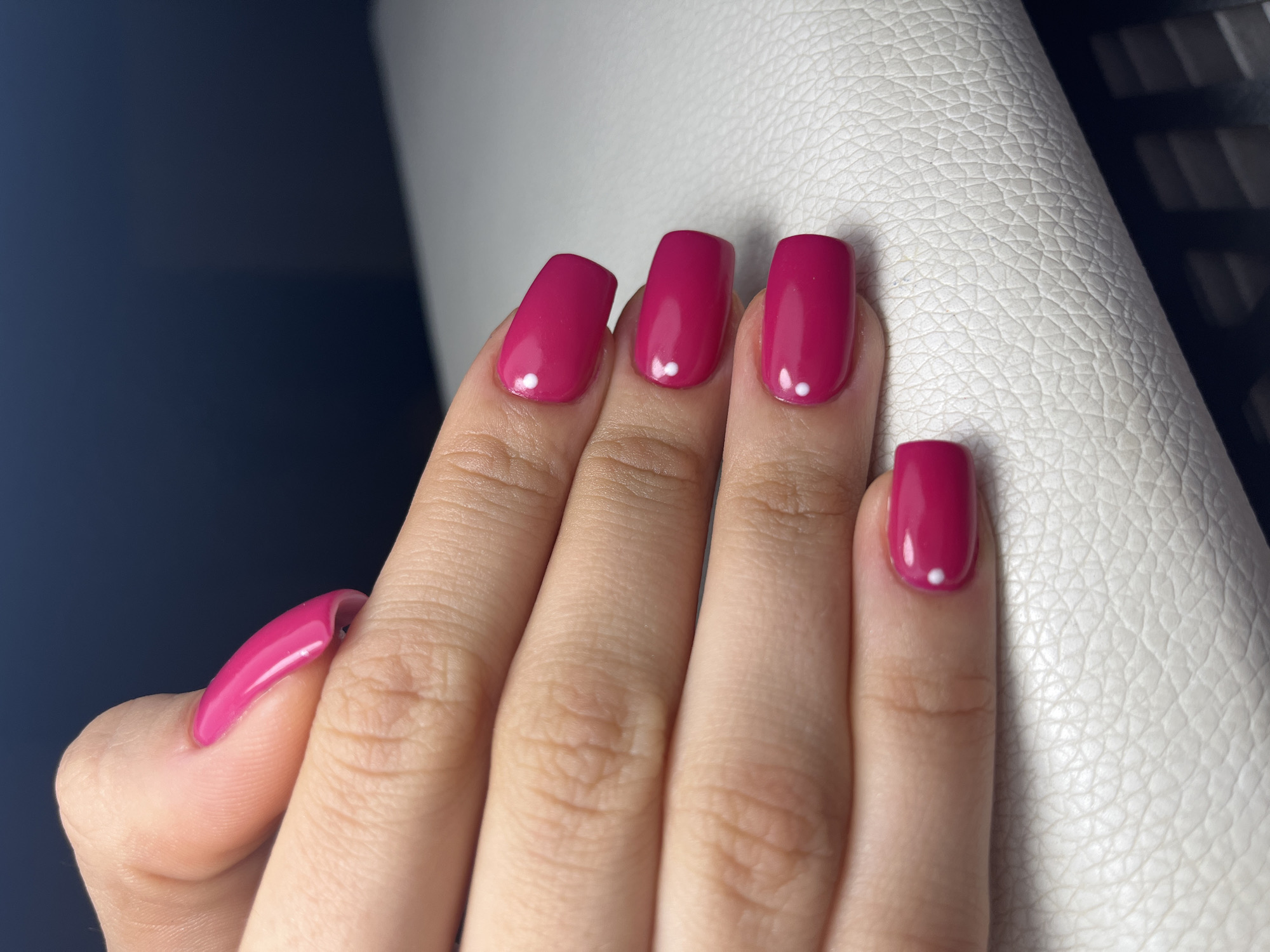 A close-up shows a human hand with four painted fingernails in a shade of magenta. Each nail has a small white dot near the cuticle. The hand rests on a white, textured surface that appears to be leather or a similar material. The background is a blurry mix of dark blue and white. There is no information present to suggest the location is Pernik, Bulgaria.