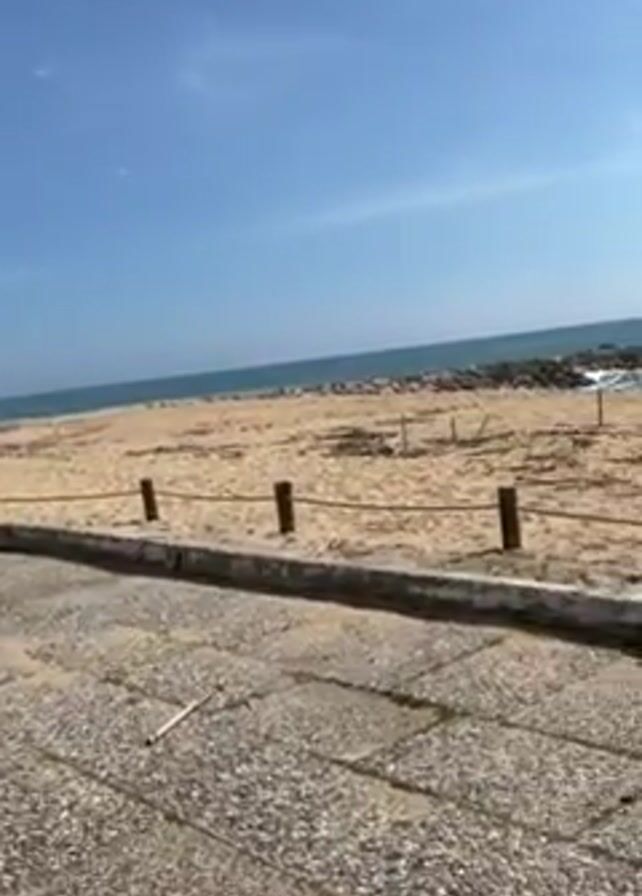 beach on a sunny day with a clear blue sky and a few scattered clouds. The beach is sandy, with a barrier of dark posts and rope separating the beach from a paved area. A black bench sits on the edge of the paved area. The ocean is visible in the background with gentle waves. There are a few people in the distance on the beach and in the water. The camera pans slightly, showing more of the beach and the coastline.