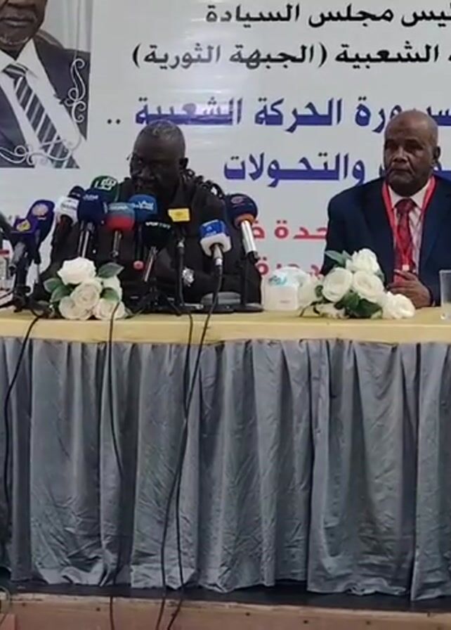 Three men are seated behind a table, speaking into microphones. They are situated in front of a backdrop with Arabic text and a picture of a man. The table is covered with a tablecloth and adorned with flower arrangements. The man in the center is wearing a military-style uniform. The other two men are wearing suits.