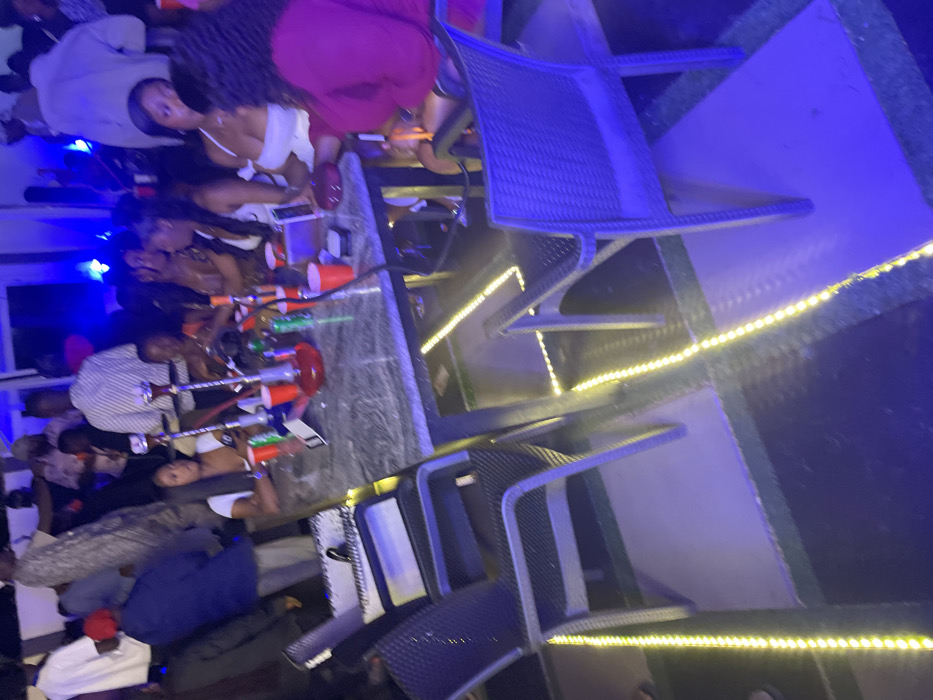 A gathering of people sits around a table, many holding hookah pipes with orange cups attached. The table is lined with string lights, and woven outdoor chairs surround it. The lighting is dim with blue and yellow hues. Some people are turned away from the camera, but those facing it appear to be socializing. The scene gives the impression of a relaxed outdoor lounge setting.