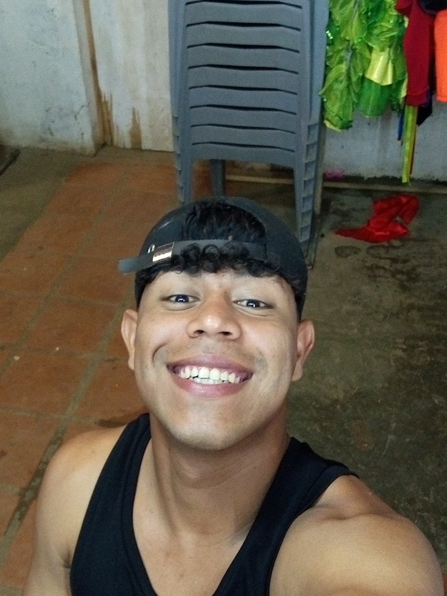 A young man with dark hair and a black baseball cap smiles directly into the camera. He is wearing a black tank top, revealing his shoulders. He appears to be standing indoors, as evidenced by the tiled floor and a wall visible in the background. Behind him is a gray plastic chair and colorful garments hanging on the wall. The photograph was taken in Porlamar, Venezuela.