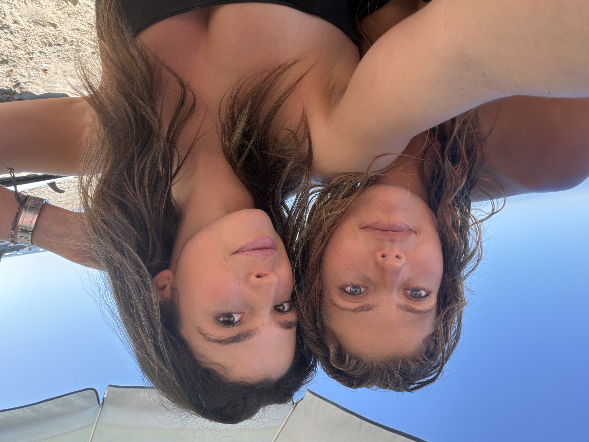 Two women are close together, seemingly taking a selfie. The background shows a blue sky and a beach umbrella, suggesting they are outdoors, possibly at a beach. They are likely in the city of Malibu in the United States of America, given the presumed location. The women are facing the camera, and their faces are visible. The image is taken from an unusual angle, appearing rotated.