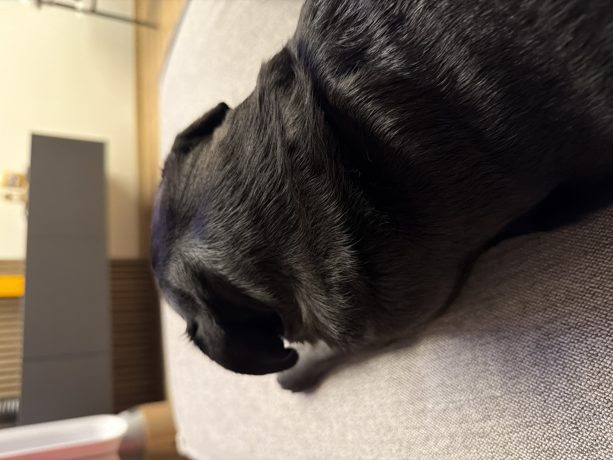 - "A close-up photograph shows a black pug resting on a gray textured surface, likely a couch" by FM-Ig8uz1, licensed under CC BY 4.0