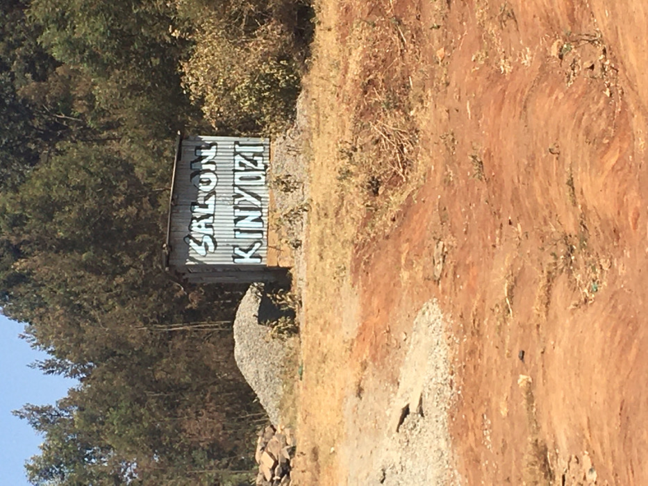 This image depicts a rural or semi-rural scene in Ndeiya, Kenya, under clear daylight conditions. The central subject is a small, single-story structure constructed from corrugated metal sheets, appearing weathered. The front of this structure features prominent white block lettering, spray-painted or hand-painted, which reads "SALON" above "KINYOZI." The structure is elevated slightly on a low, possibly concrete or stone, foundation. In the immediate foreground, the ground is composed of reddish-brown dirt, appearing dry and uneven, with visible tire tracks or erosion patterns. Sparse patches of dried grass and small green plant saplings are scattered across the dirt, particularly near the base of the structure. To the left of the structure, a substantial pile of light grey gravel or crushed stone is present. Further left, partially obscured, are larger natural stones or rocks. The background consists of a dense, verdant line of trees and foliage, predominantly green and brown, stretching across the horizon. To the immediate right of the structure, a cluster of green and brown bushes is visible. The sky above is clear and blue. No individuals, animals, or active human interactions are present in the frame. The scene conveys a sense of stillness and a functional but modest establishment within a dry, natural environment.