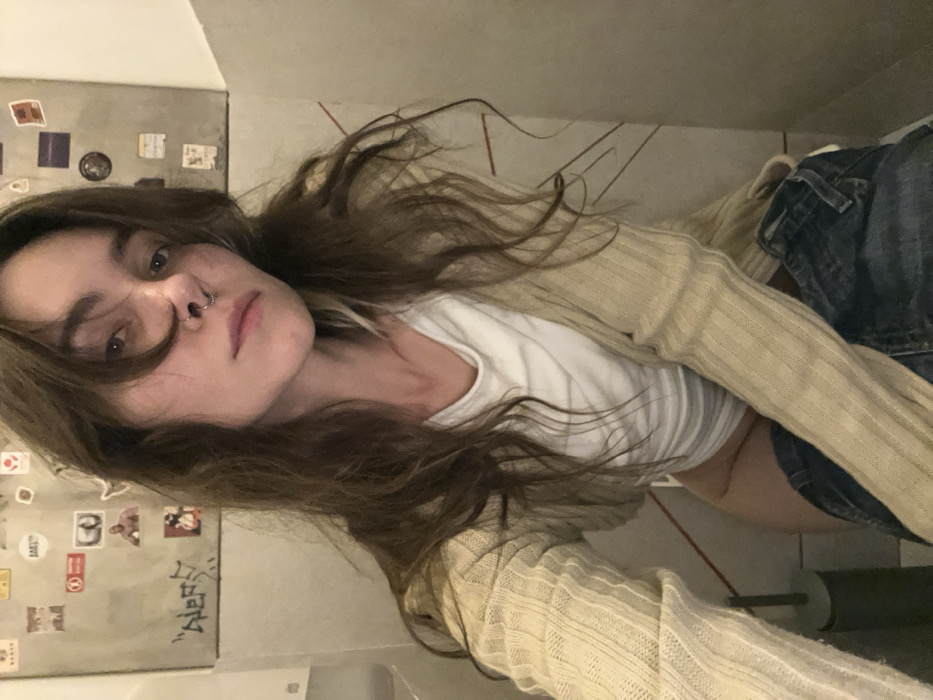- "A young adult female is depicted in a close-up, waist-up selfie, seated within what appears to be a public or private restroom stall" by FM-FmE2k1, licensed under CC BY 4.0