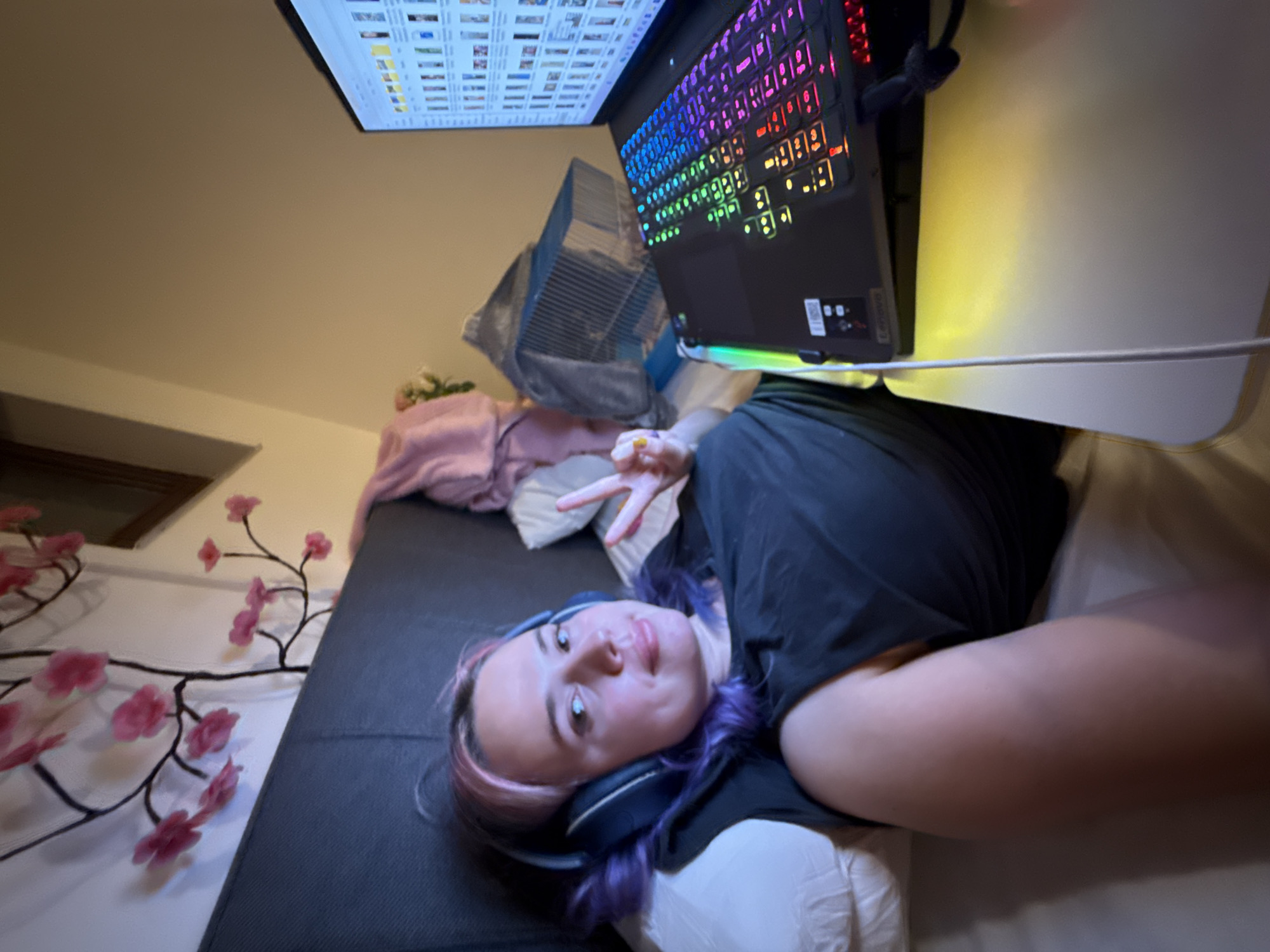 The scene depicts an indoor environment, likely a bedroom, situated in the City of Zagreb, Croatia. A female individual with pink and purple hair, wearing a black sleeveless top and dark headphones, is positioned on her back on a bed. Her head rests on a white pillow against a dark grey upholstered headboard. She is facing the camera with a subtle smile, her left hand raised in a two-finger 'peace' gesture; her fingernails are painted yellow. Adjacent to her on a light-colored, elevated surface is an open black Lenovo laptop, featuring a multicolored RGB backlit keyboard. The laptop screen displays a grid of numerous small image thumbnails. A white cable is connected to the laptop. In the background, a pink blanket is partially visible on the bed, and a decorative wall fixture resembling a tree branch with pink flowers is mounted on a light-colored wall. A grey mesh-covered object is present behind the laptop. A window frame is partially discernible in the upper right background.
