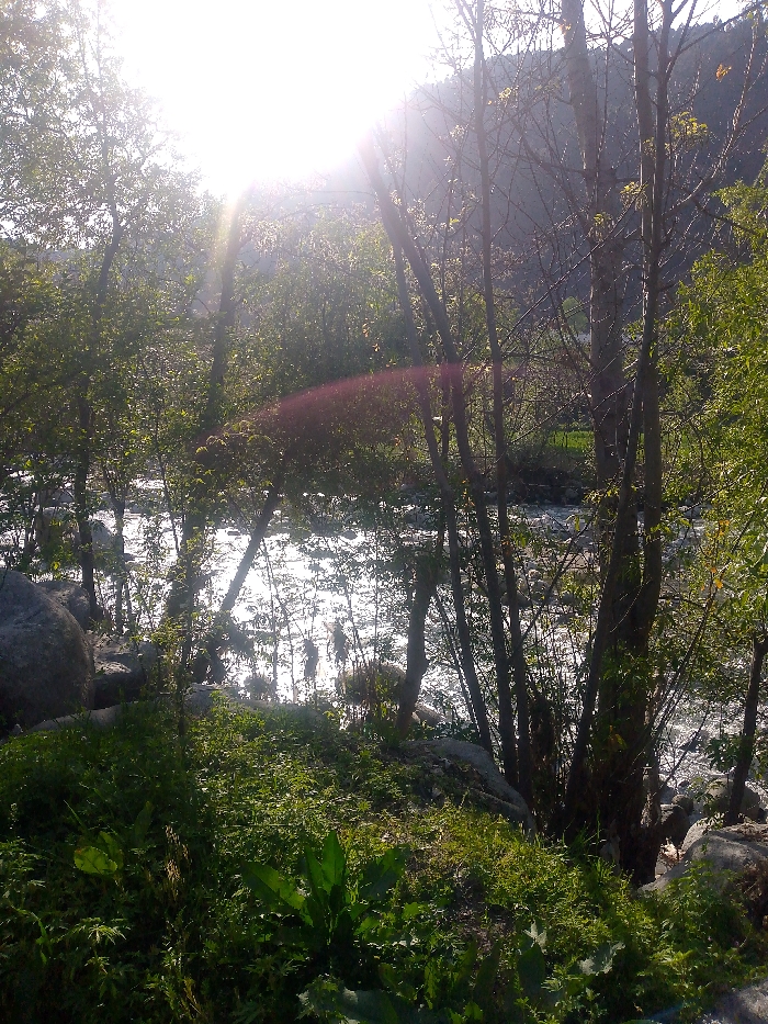 The image displays a natural outdoor scene in Dharyal, Pakistan, characterized by strong sunlight and dense vegetation alongside a body of water