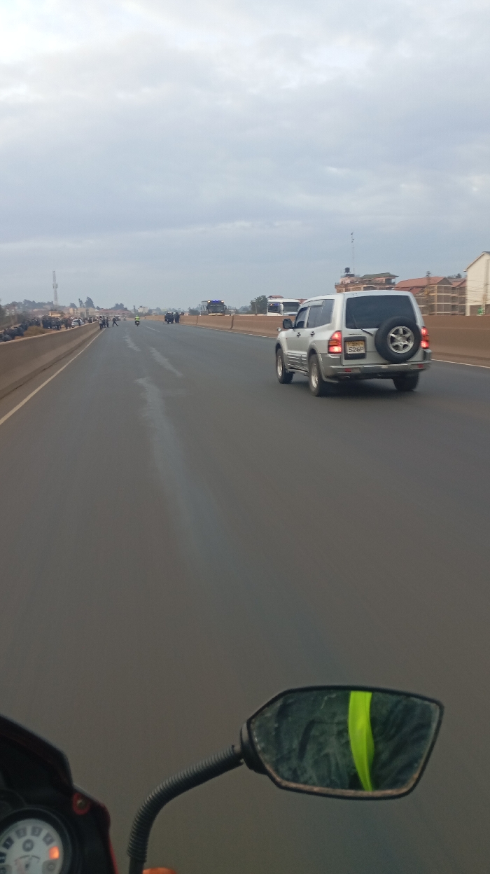 A silver SUV drives on a multi-lane road under a cloudy sky. The road surface appears wet, with a faint streak running down the center lane. In the distance, a gathering of people stands by the roadside. In the foreground, the motorcycle's speedometer and side mirror are visible, the mirror reflecting a bright green object. Buildings can be seen on the side of the road.