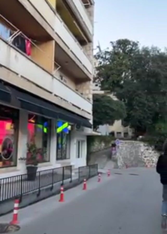 street scene in what appears to be a European town. A multi-story building with balconies is on the left. The ground floor has shops with black awnings. One appears to be a barber shop. A black metal railing runs along the sidewalk with small orange cones lining the edge of the walkway. The street slopes uphill. Two people are walking away from the camera up the street. Trees and other buildings can be seen in the background. The sky is a light blue color.
