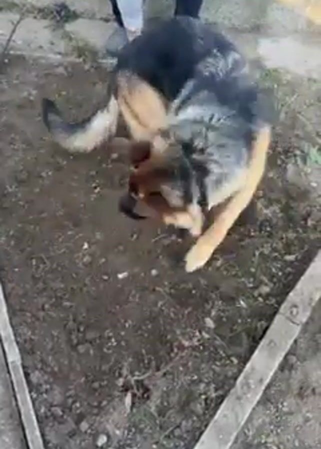 A person in grey sneakers and black pants stands beside a rectangular patch of exposed earth. A medium-sized, black, brown, and white German Shepherd dog is on the patch of ground, rolling around and rubbing its back into the dirt. The patch is surrounded by grey concrete edging. Some sparse green plants are growing nearby.