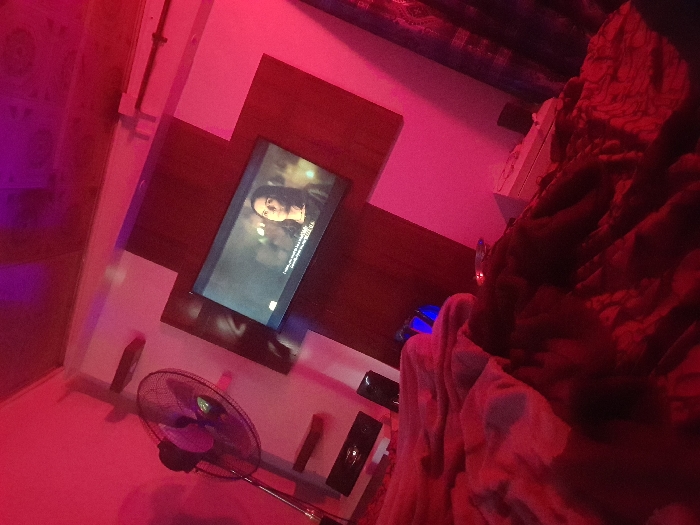 The scene is an indoor room in Kabong, Nigeria, characterized by dominant red and purple artificial illumination. In the foreground, an unmade bed with rumpled red patterned blankets occupies the lower portion of the frame. To the left, a black pedestal fan with a metallic stand is positioned upright. Above and to the left of the fan, three small, rectangular shelves are mounted on the light-colored wall. Centrally, a flat-screen television is mounted on a dark brown, cross-shaped wooden panel, displaying a medium shot of a female individual with dark hair and visible subtitles. To the right of the bed, a white rectangular object, consistent with a bedside table or storage unit, is visible, alongside a smaller device emitting a blue light. A dark, patterned curtain is partially visible on the far right. The ceiling is also visible towards the top of the frame. No individuals are physically present within the depicted room.