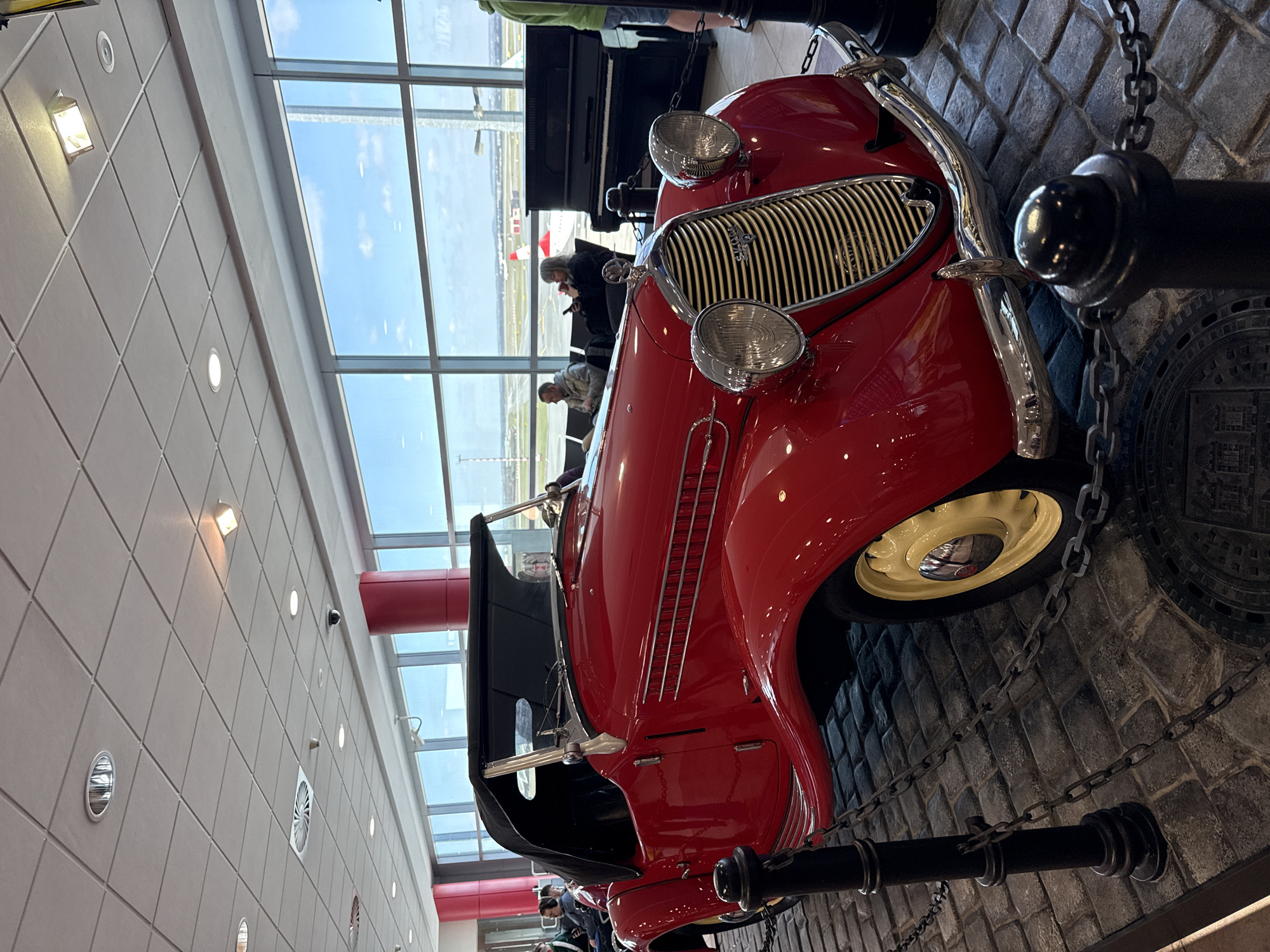 A bright red vintage Skoda convertible car, featuring a black soft top and cream-colored hubcaps, is displayed prominently on a raised, cobblestone-patterned platform. The car is secured by black bollards linked with chains, and a decorative circular manhole cover is visible on the platform. The front of the vehicle exhibits a chrome grille with the "SKODA" emblem and two large chrome headlights. The setting is within the Václav Havel Airport Prague terminal building in Prague, Czechia. This is identifiable by the large floor-to-ceiling windows that form the background, overlooking an aircraft tarmac where at least one white airplane with a red tail is visible. Distant airport infrastructure and a clear sky with sparse clouds are also seen through the windows. Inside the terminal, behind the car, several individuals are seated in what appears to be a waiting area. Two figures are clearly visible: a man in a light jacket engrossed with a mobile device, and a woman with gray hair holding a cup. A black upright piano is situated behind these individuals. The terminal interior features a white suspended ceiling with integrated lighting and ventilation systems, contrasting red structural columns, and a light-colored tiled floor leading up to the display platform. A partial view of another person in a green jacket is visible on the right side of the frame.