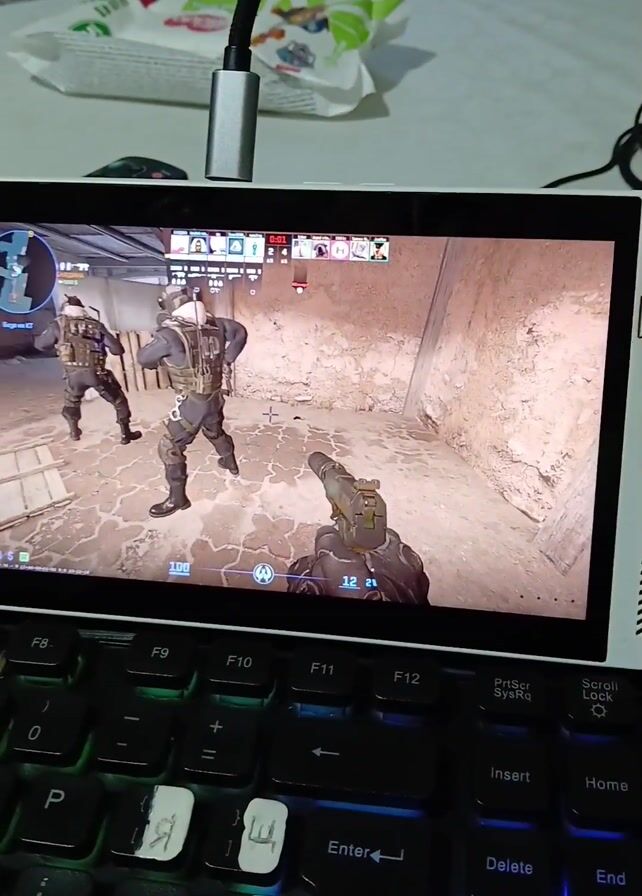 A person is playing Counter-Strike on a small white laptop with a black keyboard