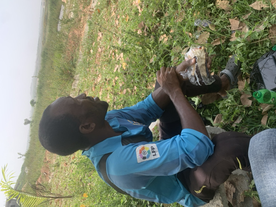 An adult male is observed seated outdoors in Karsana 2, Nigeria. He is positioned on a light-colored concrete block or rock, facing towards the right of the frame with his mouth slightly ajar, suggesting communication. The male has dark skin, short dark hair, and a short beard or stubble. He is wearing a light blue, short-sleeved collared shirt with darker blue horizontal stripes and a "LFP" (La Liga) logo on the right sleeve. Dark pants and grey Crocs are also visible. A dark strap, possibly from a bag, crosses his left shoulder. His right hand holds a dark-colored food item, likely a pastry or cake, encased in clear plastic wrapping. On the ground in front of him, amidst green grass, weeds, and scattered dry leaves, a green plastic bottle (identified as 7Up) and a dark rectangular electronic device (possibly a mobile phone or tablet) are visible. Part of another individual's leg, clad in blue jeans, is visible in the lower-left foreground. The background consists of an open, grassy area with scattered vegetation and a hazy distant horizon. A small, young palm tree stands to the left in the middle ground, with some concrete structures on a slight incline behind it.