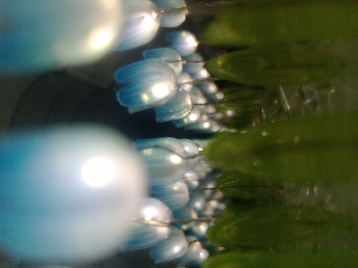 The scene depicts an artificial light installation located in Lomas de Zamora, Argentina. The foreground presents blurred, vertically oriented green elements consistent with artificial foliage or stems. Above these, numerous illuminated artificial flowers extend throughout the midground and background. Each flower possesses translucent blue or aqua-colored petals, resembling a tulip, and contains a distinct, bright white internal light source. These lights create a diffused glow, with several highly out-of-focus light points appearing as large, soft orbs in the upper portion of the frame. The flowers are supported by thin, dark stems. The background is dark and indistinct, indicating an enclosed indoor environment. No individuals, specific actions, or interactions are visible within this static display.