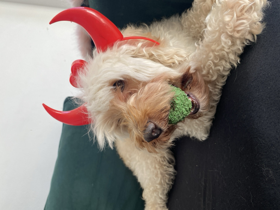 A tan poodle lies upside down on dark upholstery. The dog has fluffy white hair and wears red devil horns. It holds a textured green ball in its mouth. The dog faces the viewer with one eye visible. Part of a green couch is in the upper-left of the image. The background is partially white.