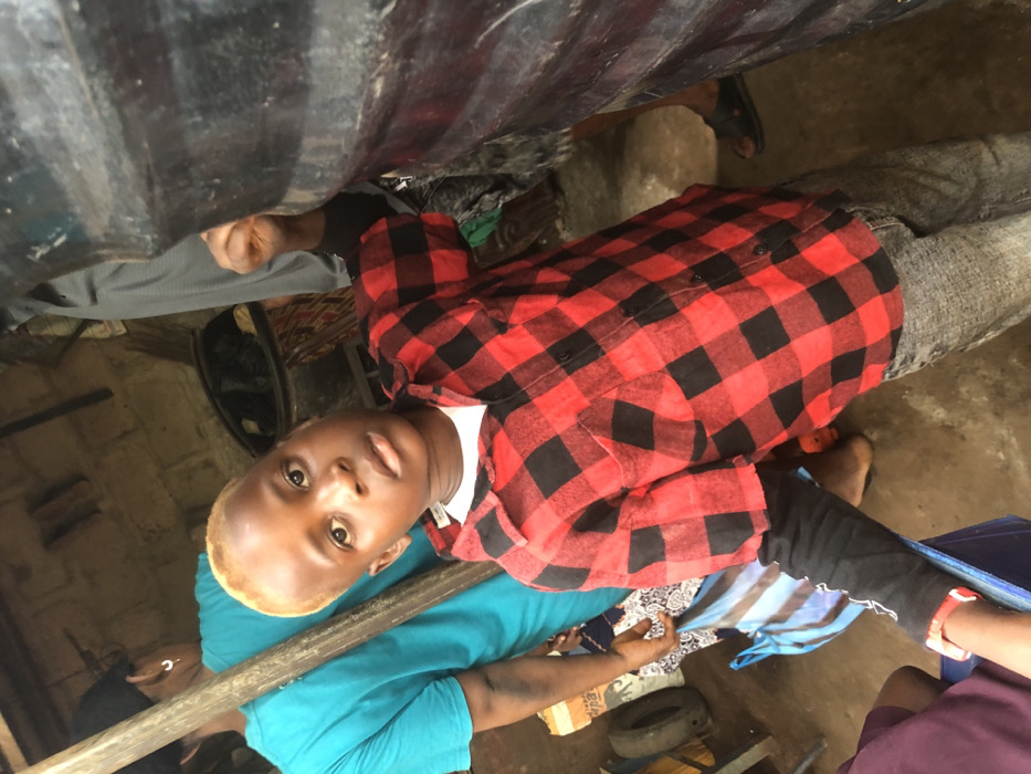 A person with blonde hair, wearing a red and black flannel shirt, is positioned in the center of the frame. They are surrounded by other people, including one wearing a teal shirt. The setting appears to be cluttered and dimly lit, with various objects scattered on the ground, including tires and miscellaneous items. A corrugated metal sheet looms overhead. The shot is taken from an unusual angle.