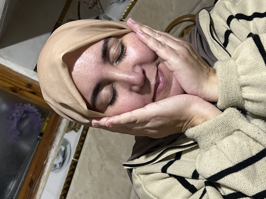 A woman with closed eyes rests her face in her hands. She wears a tan hijab covering her head. Her complexion is fair, and her lips are slightly parted. She is wearing a beige sweater with thick, dark horizontal stripes. The background appears to be indoors, showing a tiled wall and a window with reflections. The overall image has a soft, peaceful feel.